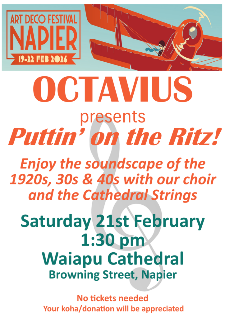 In the spirit of the 2026 Art Deco Festival, Napier’s Octavius Chamber Choir will present an art deco concert with a difference in the Waiapu Cathedral on Saturday 21 February. This is an addition to the Festival programme for all to enjoy!